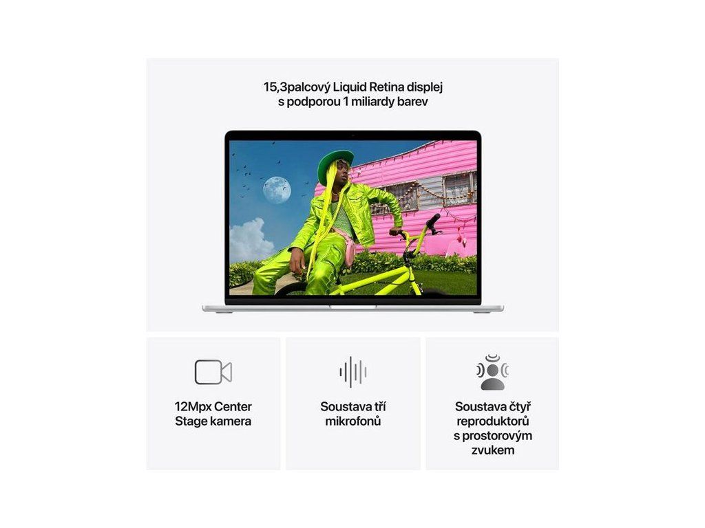 Soustava tří mikrofonů. MacBook Air vylepšuje srozumitelnost hlasu při audiohovorech i videohovorech – s minimem ruchů na pozadí. Zvuk, co tě pohltí. Reproduktory MacBooku Air podporují prostorový zvuk Dolby Atmos, takže si u hudby i filmů užiješ skutečně trojrozměrnou zvukovou scénu.
